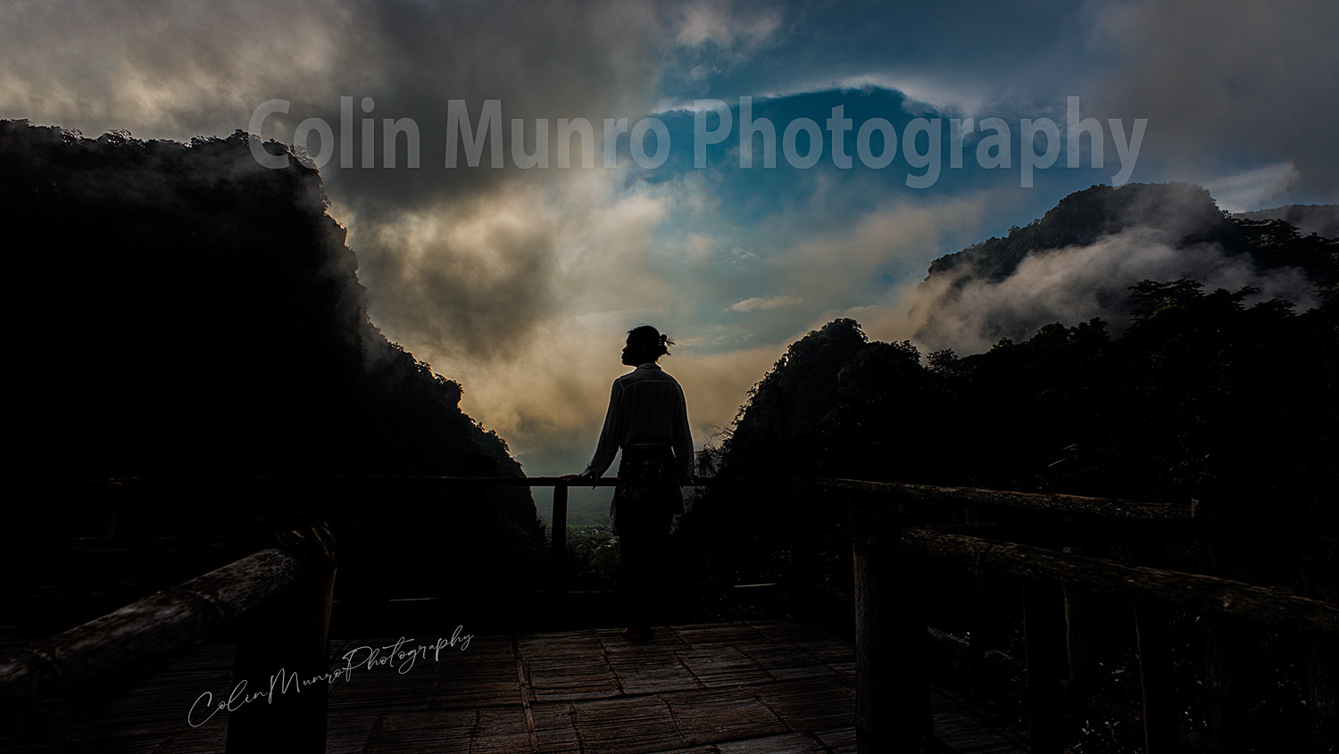 Rain clouds gather just after dawn, looking across at the mountains of Eastern Myanmar. A gril, in near silhouette, looks out across the mountains. Colin Munro Photography